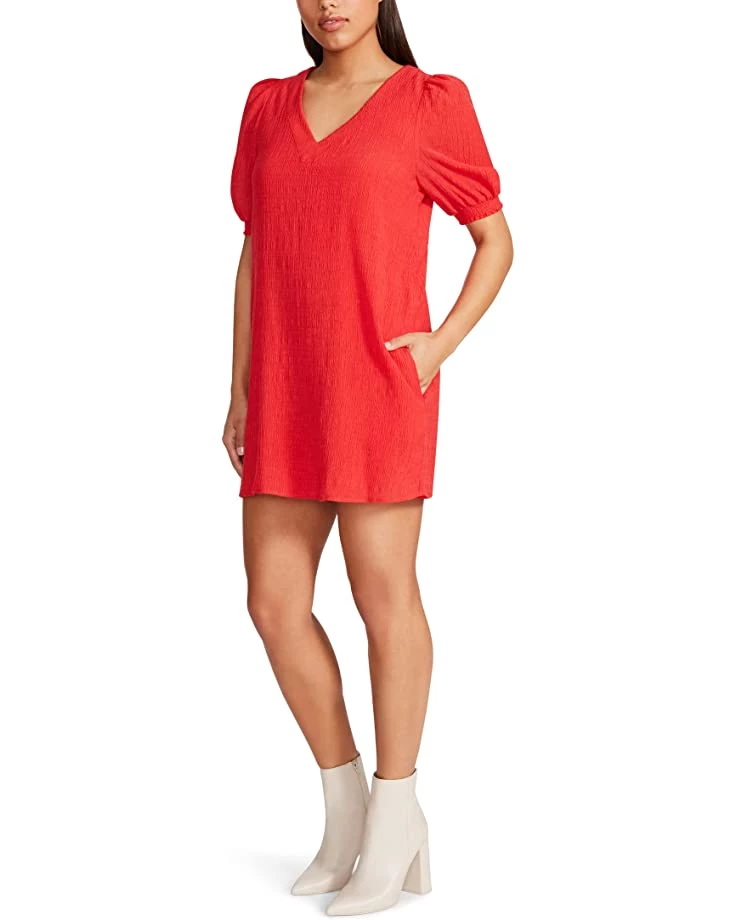 - Day dress boasts a V-neckline and short sleeves.